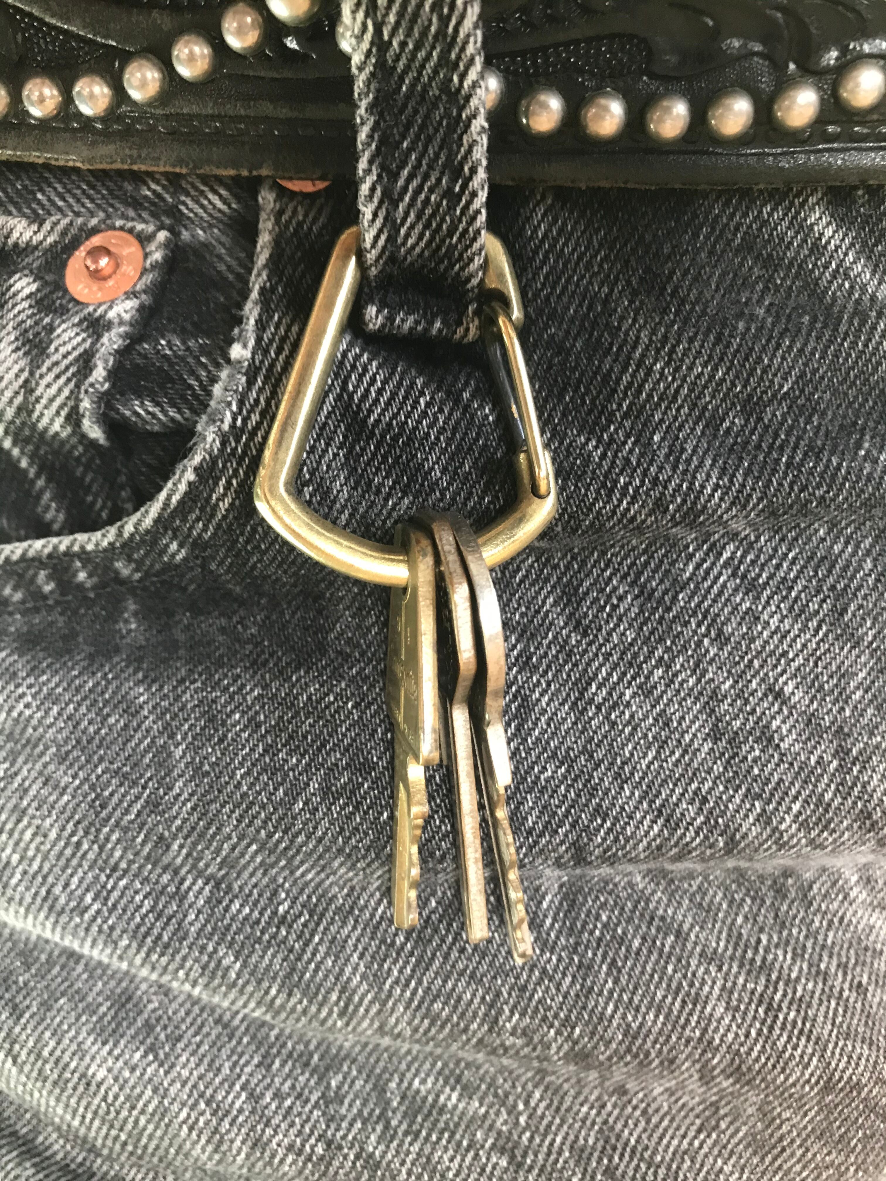 必要最低限のシンプルなデザインに仕上げました。ベルトループにぶら下げて付けるのはもちろん、VIN'Sのキーフックに合体させることも出来るというとても幅広い使い方が出来るカラビナとなっておりますよ。